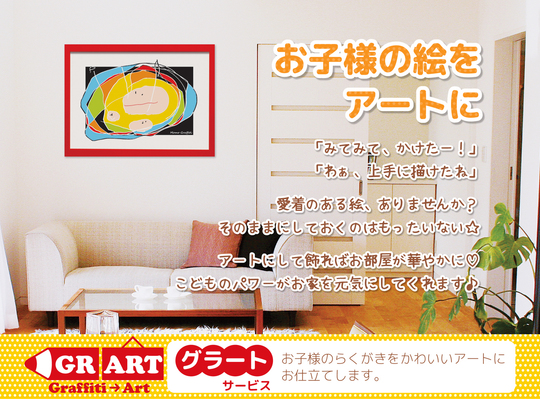 そんな「困った」を解決し、願いを叶えるサービスです♪ ご祖父母さま、ご来客者さまにも「子どもが描いた絵なの!?」とビックリされるとの声がたくさん寄せられています。 なによりも、お子さま本人がとても喜ぶとのことで、ご好評を頂いています。