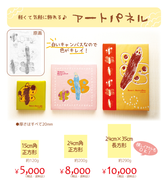 アートパネルMと長方形の資材が、仕入先の販売停止に伴いまして、入手できなくなりました。大変申し訳ございません。しばらく受注を休止させていただきます。 アートパネルSはご注文可能です。よろしくお願いいたします。