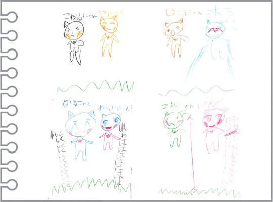 ねこちゃんたちの表情がとても豊かで、描いているときの楽しさがとても伝わってくる絵ですね。