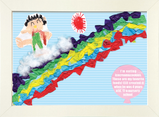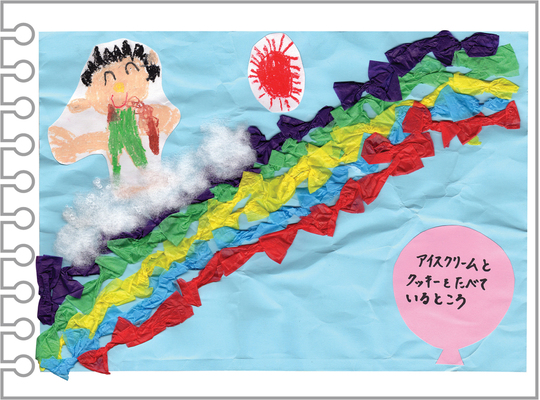 雲の上で大好きなアイスやクッキーを食べるえいじくん。とても幸せそうですね♪